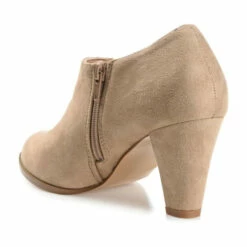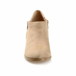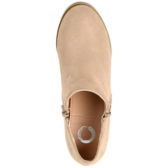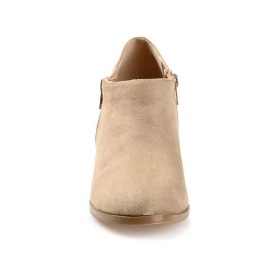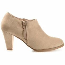 Basic but stylish, the Sanzi bootie by Journee Collection. This low-cut style features soft vegan leather uppers and a classic almond toe complimented by zippers at the ankles. A cone pump heel, wide-width footbed, and comfort insole create a comfortable lift.