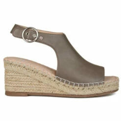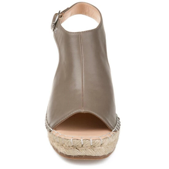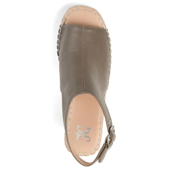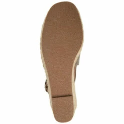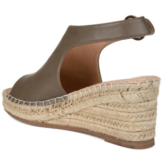 Show off summer-ready style with espadrille wedges. Smooth faux leather uppers with a buckled ankle strap style complements intricate textured espadrille wedge sandals. Top-stitching borders the sole of each shoe to complete the look.