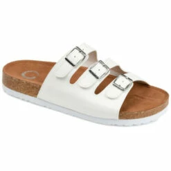 The Desta is a unique take on a trending style. This slip-on sandal features a triple strap with three square buckles and a synthetic cork outsole. The soft faux leather material opens up at the toe so you can have free movement, and the insole is lined with a soft material for extra comfort. Available in unique patterns such as floral and leopard.