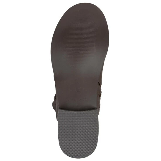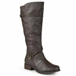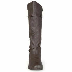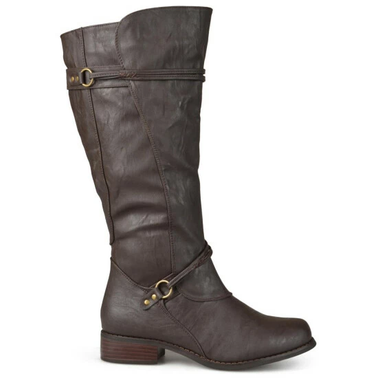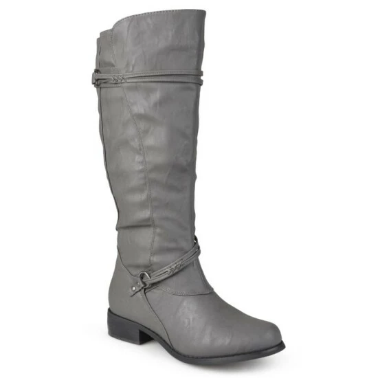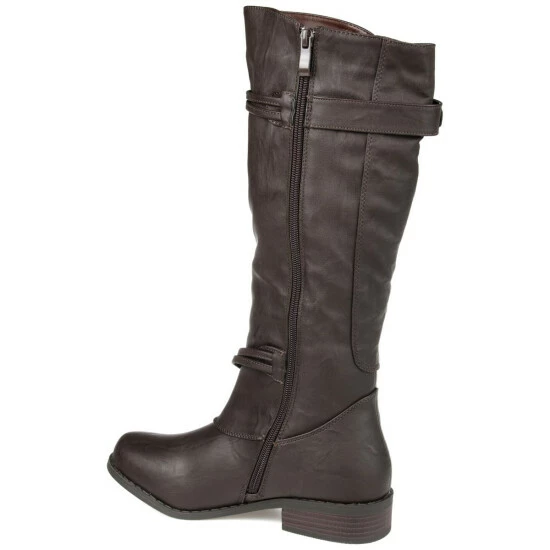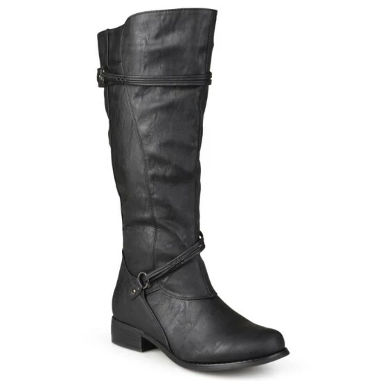 Express your style versatile riding boots by Journee Collection. These fall boots feature soft faux leather uppers that rise to below the knees with shafts that rise higher in the front. Strappy detail accents the ankles to complete the look