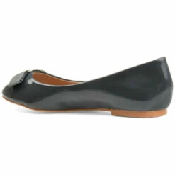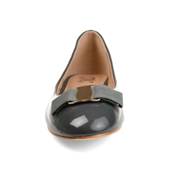 Look polished from day-to-night in bow accent flats by Journee Collection. These stylish ballet flats feature lustrous faux leather with a patent finish. A classy fabric bow with a centered polished metal emblem finishes the look.