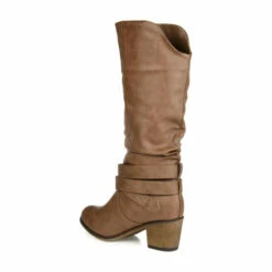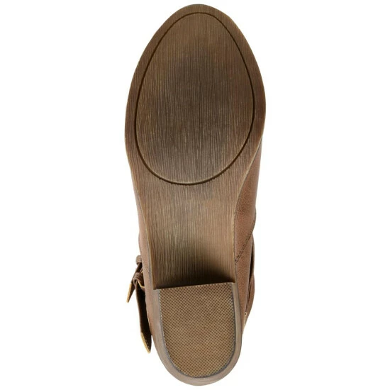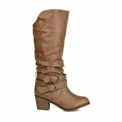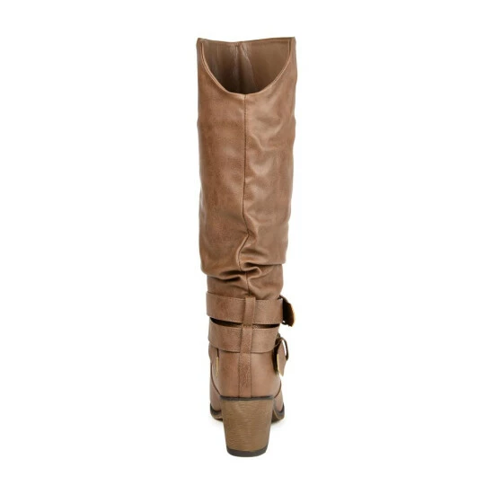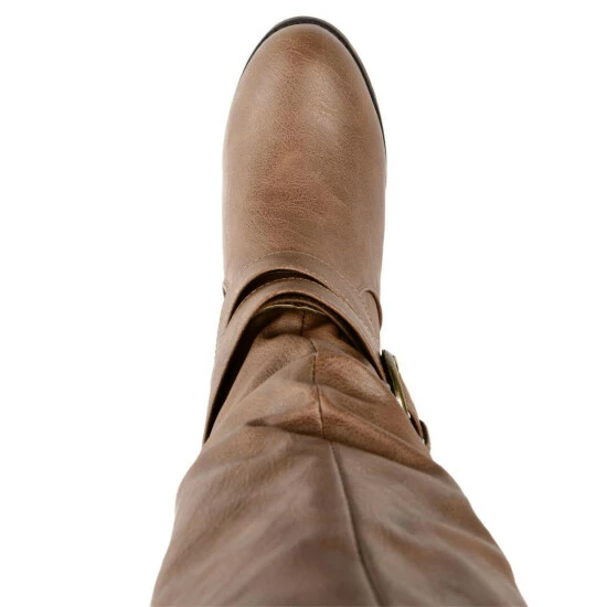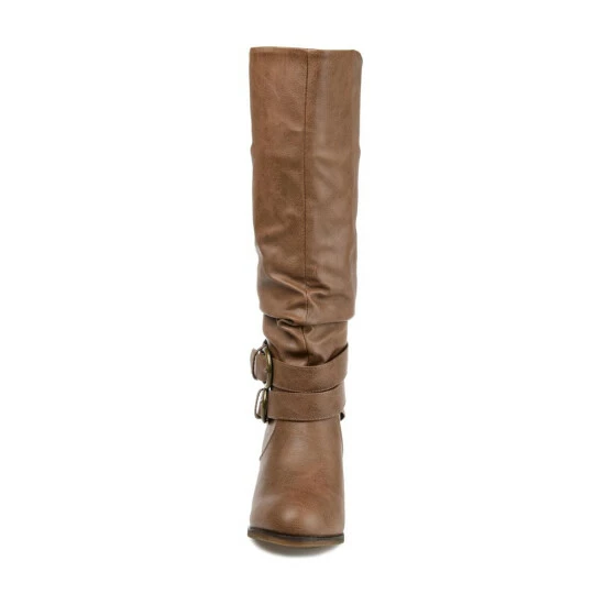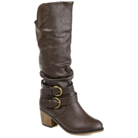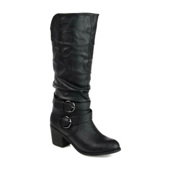 Step into trend-setting style with these buckle boots by Journee Collection. These fashionable boots feature premium faux leather uppers that rise mid-calf with slightly raised angular vamps in the front.