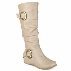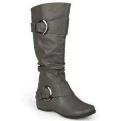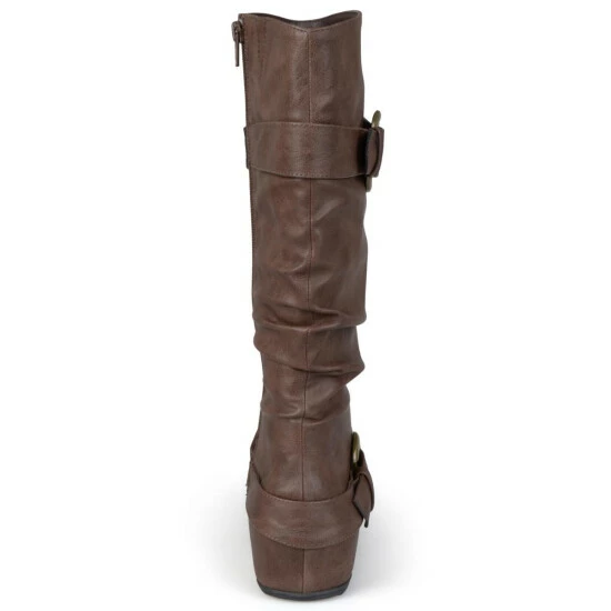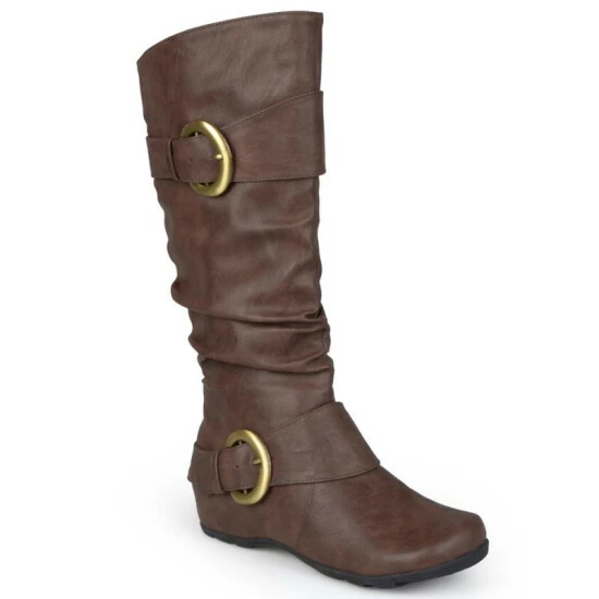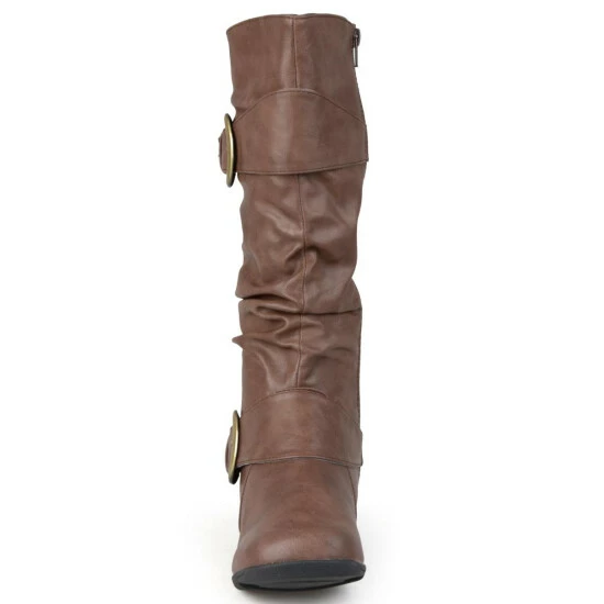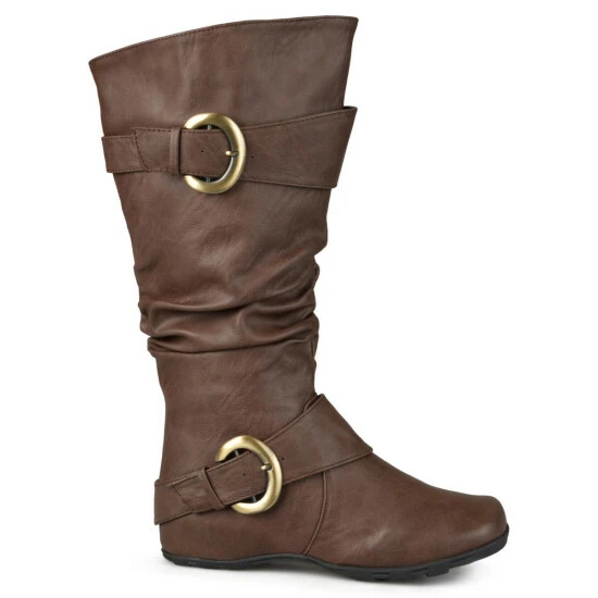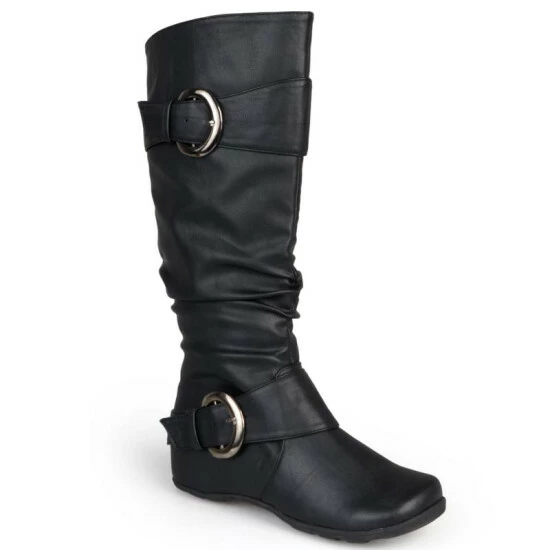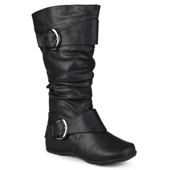 Show off one of the best styles of the season in tall boots by Journee Collection. These fashion boots feature premium faux leather uppers that rise mid-calf and highlight a subtle slouchy design with wide straps and buckle accents.