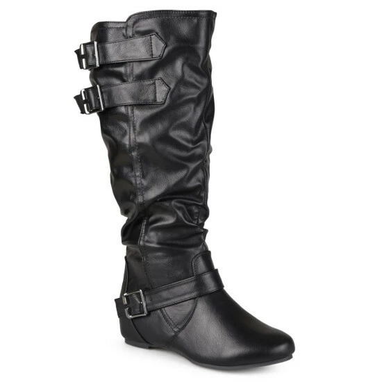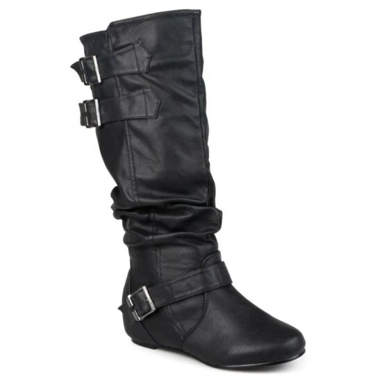 Express your style in chic flat boots by Journee Collection. These cute boots feature faux leather uppers that rise mid-calf and highlight slouchy detail on the shafts for a relaxed look. Straps with buckles accent the ankles and shafts.
