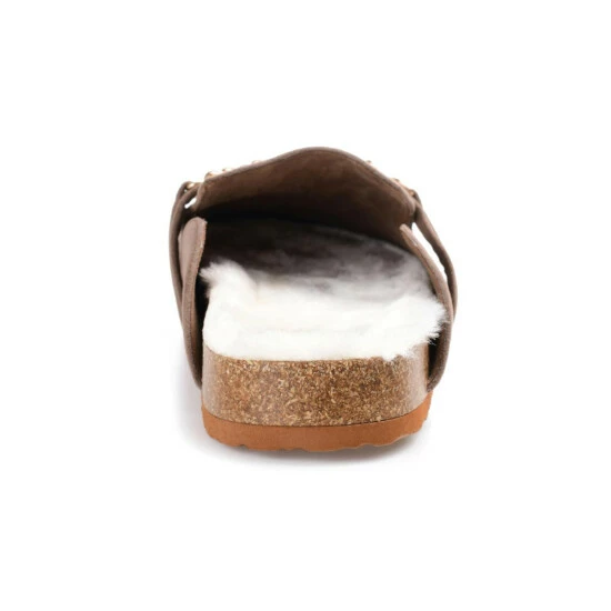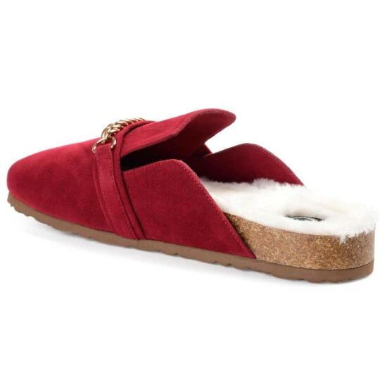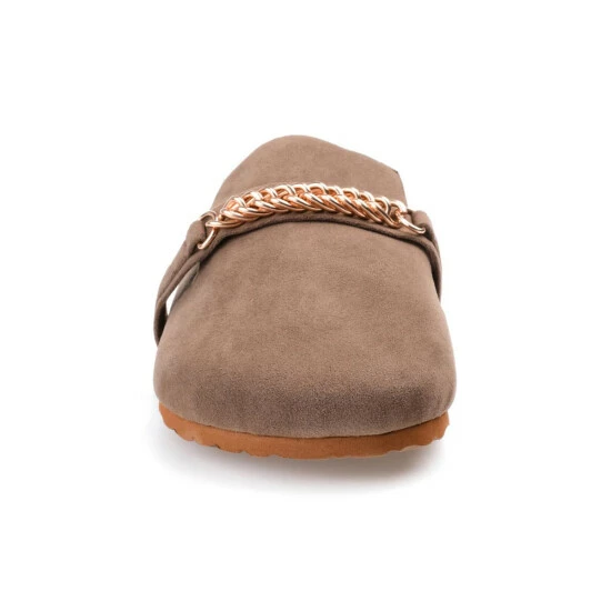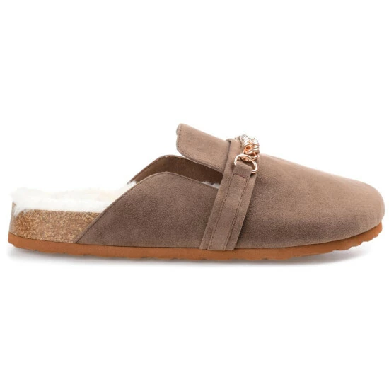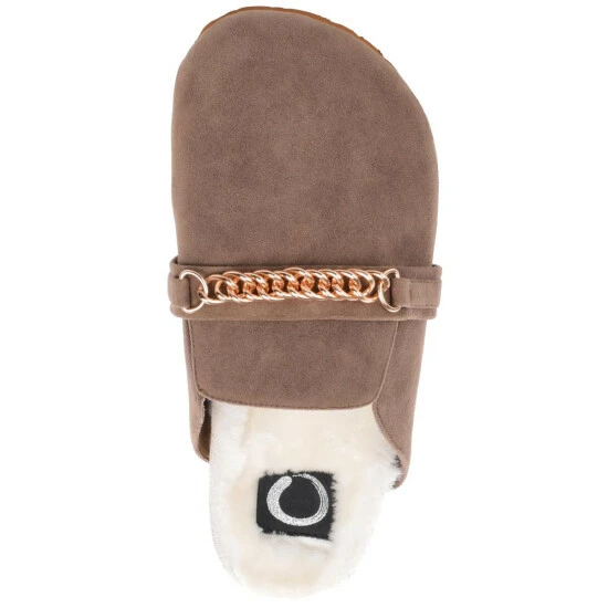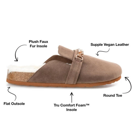 Easy like Sunday morning, the Quinnie mule by Journee collection. A soft 4 mm Tru Comfort Foam insole lined with the coziest poly blended faux fur shapes this effortless slip-on style. A gold-toned chain at the vamp, vegan leather, and a round-toe perfect the look and provide a hug-like fit.