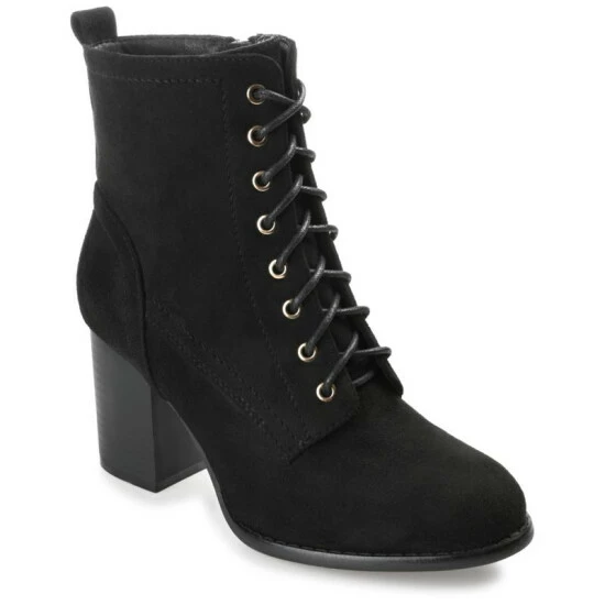 Show off a trendsetting look with heeled Granny booties by Journee Collection. Faux suede uppers rise above the ankles and highlight a front lace-up design. Chunky stacked high heels add modern style to finish the look. At Journee Collection, our booties will give you that comfortable yet stylish look, perfect for when youβre in the office all the way to a fun night out with the girls.
