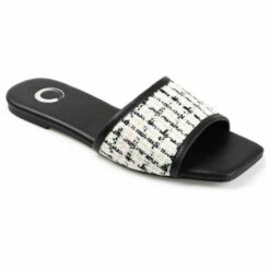The Mikala by Journee Collection is a classic look gone casual. Tweed fabric and piping details top this backless vegan sandal. A square-shaped open-toe, medium width and a comfortable padded insole perfect this sleek slide.
