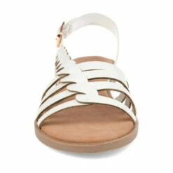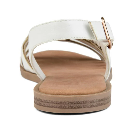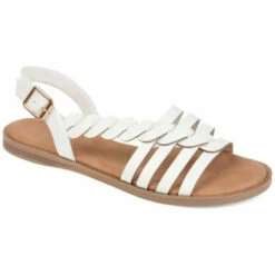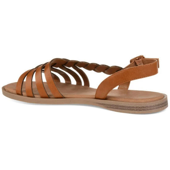 The Solay sandal by Journee Collection is such a unique piece to add to your closet. This fun sandal features a braided diagonal strap detail with a multi strap toe design. This sandal is unique where it has a buckle detail, but this is a slip-on shoe. You can easily slide your foot in and have the back to hold you in place. The medium width, cushioned insole finishes off the design.