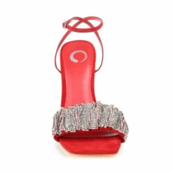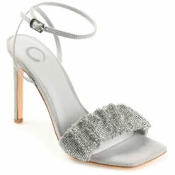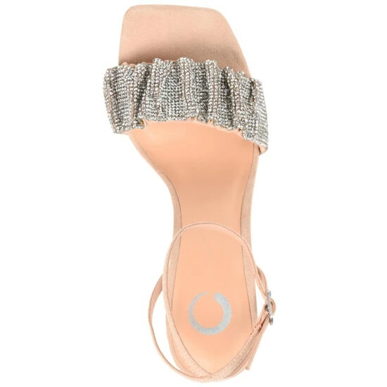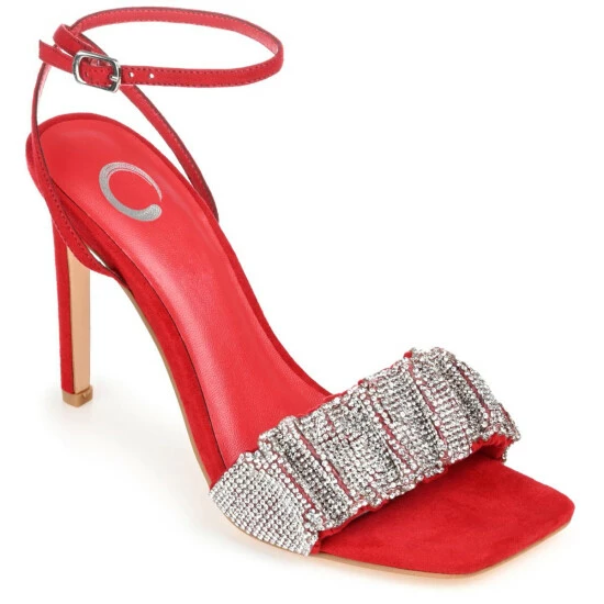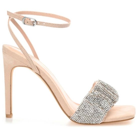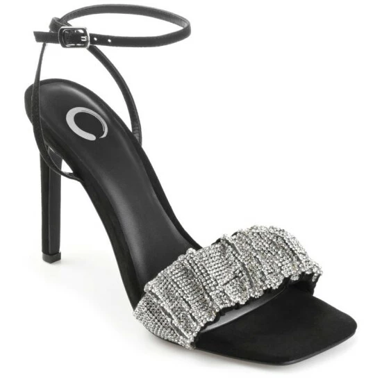 An ultra-lux look for your next night out, the Arlette by Journee Collection. This strappy stiletto features vegan leather uppers covered with shimmering rhinestone details. A 4 mm Tru Comfort Foamโข footbed lines the insole for walkability.