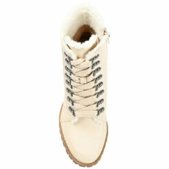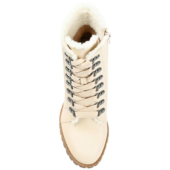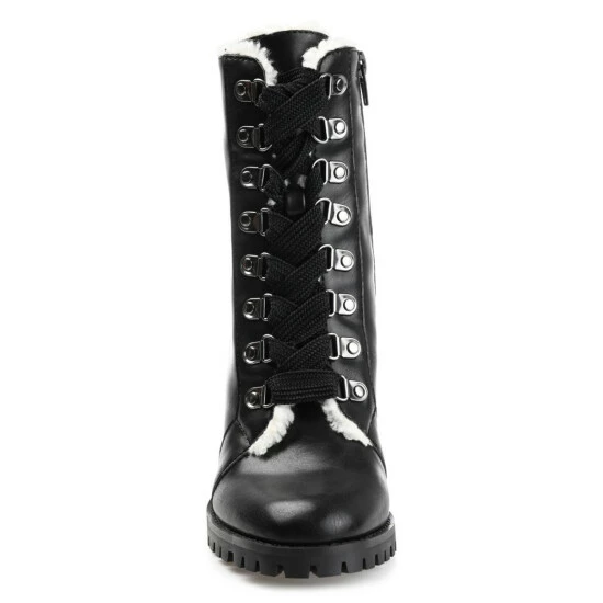 Cozy but elevated, the Fauna bootie by Journee Collection. This fall essential features faux shearling trim and lace-up hardware paired with a covered block heel for a fresh take on the combat style. A supportive 4 mm Tru Comfort Foamβ’ footbed and inside zipper make this vegan leather design easy to walk in and slip-on. At Journee Collection, our booties will give you that comfortable yet stylish look, perfect for when youβre in the office all the way to a fun night out with the girls.
