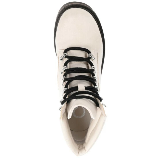 - Lace-up style, metal hardwear, treaded outsole with wood insert detail