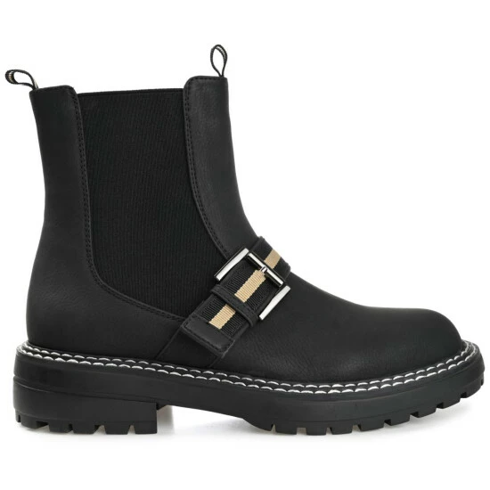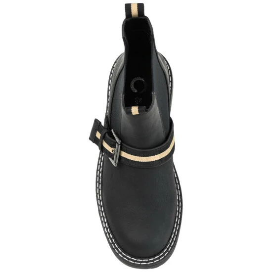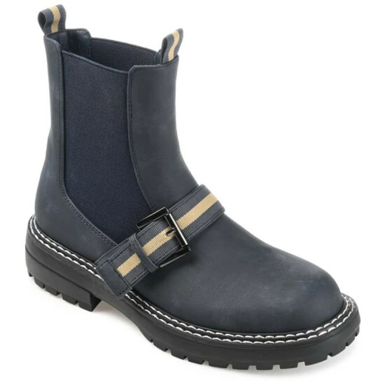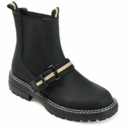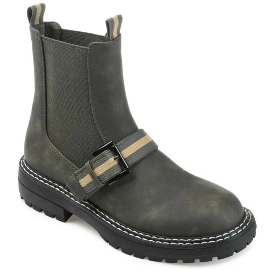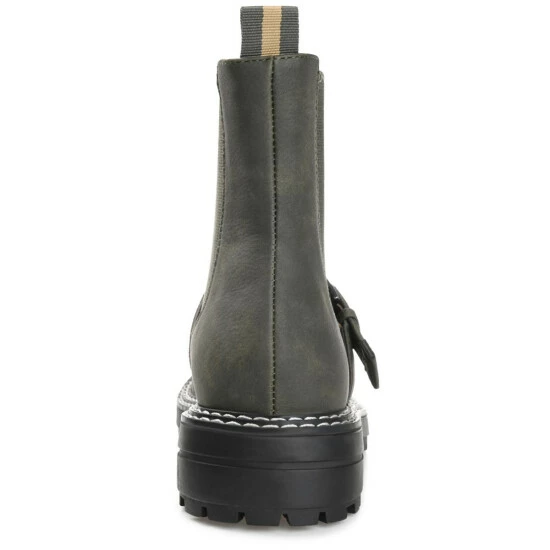 A basic combat bootie that pairs perfectly with everything in your wardrobe. This pull-on Chelsea style features luxe vegan leather with stretch gore panels at the sides for a forgiving fit. A chunky treaded sole adds the right amount of grip, and a 4 mm Tru Comfort Foamโข insole offers support with every step. At Journee Collection, our booties will give you that comfortable yet stylish look, perfect for when youโre in the office all the way to a fun night out with the girls.