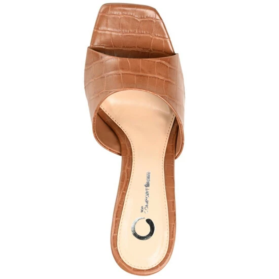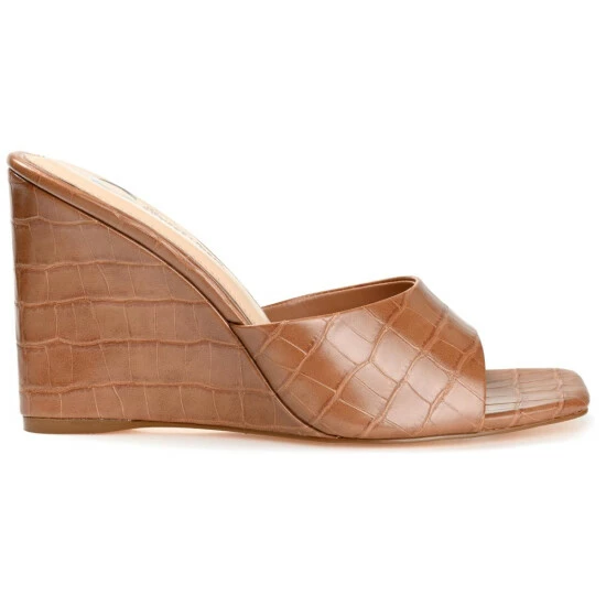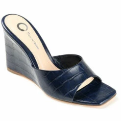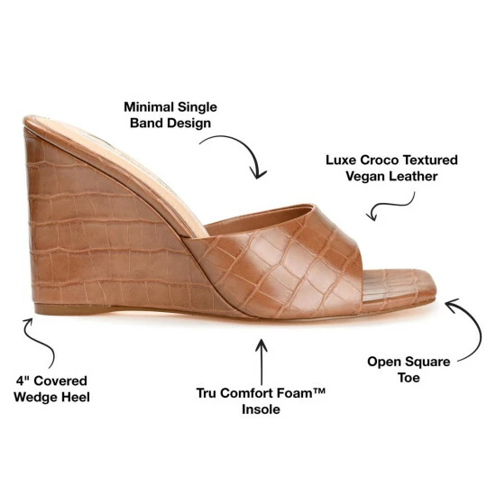 The comfortable heels you’ve been waiting for, the Vivvy by Journee Collection. This slip-on silhouette features croc textured vegan leather uppers complemented by a Tru Comfort Foam footbed for a comfortable fit. A simple band at the toe and a lofty wedge heel define the shape.