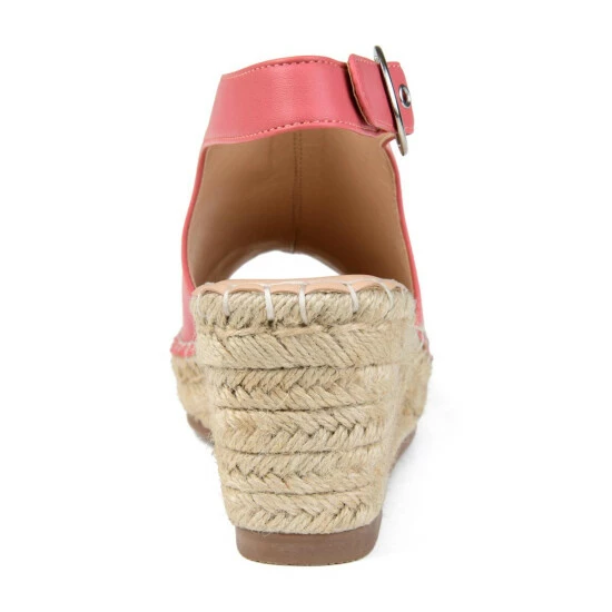 Walk in style and comfort this summer with the Crew by Journee Collection. Smooth vegan leather uppers with a buckled slingback strap top this espadrille covered wedge heel for an earthy look. A breezy open back, padded insole, and wide-width footbed complete the design for a practical finish.