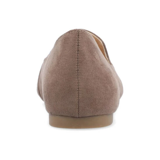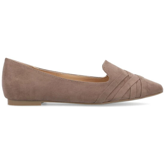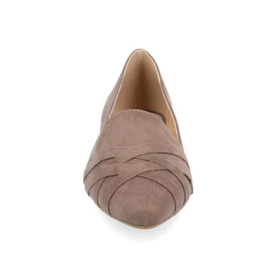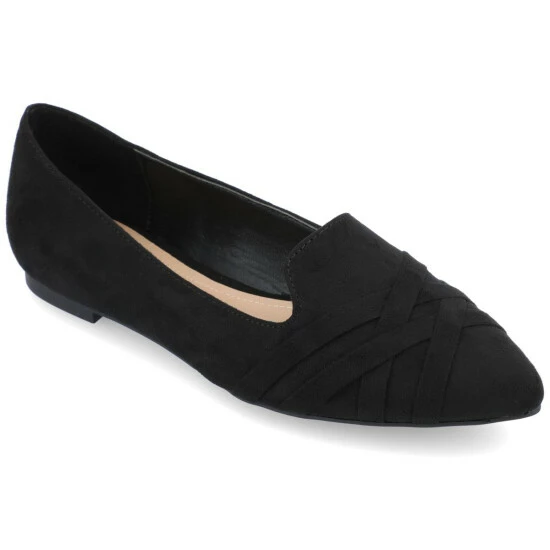 The work-wear loafer flat designed for comfort. The Mindee flat Journee Collection features a crisscross detail at the vamp and a classic pointed toe. Buttery soft vegan suede resting on a padded insole and wide width footbed maximizes the comfort. At Journee Collection, our flat styles will have you looking just as professional as the boss at work to having the cutest shoes when you go out for the night.