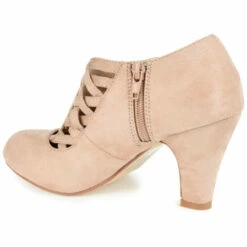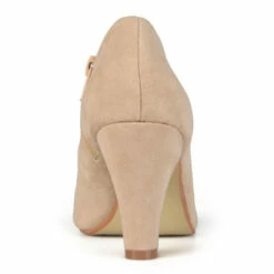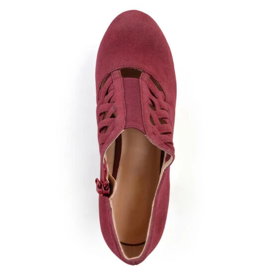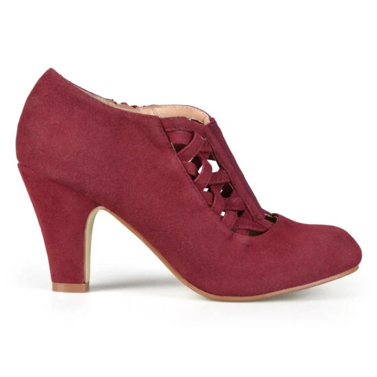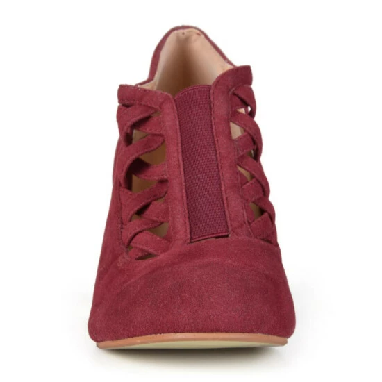 The crisscross heeled bootie by Journee Collection features soft faux suede uppers and basket weave crisscross straps on the vamps. Chunky high heels provide subtle lift to the style and inside zippers finish the design.