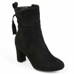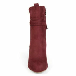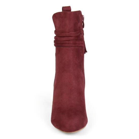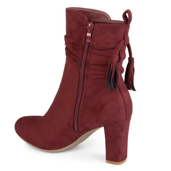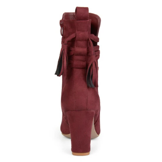 Show off chic style in ankle wrapped booties by Journee Collection. These booties feature premium faux suede uppers that rise above the ankles. A stylish tasseled strap wraps around the ankles and chunky high-heels complete the design